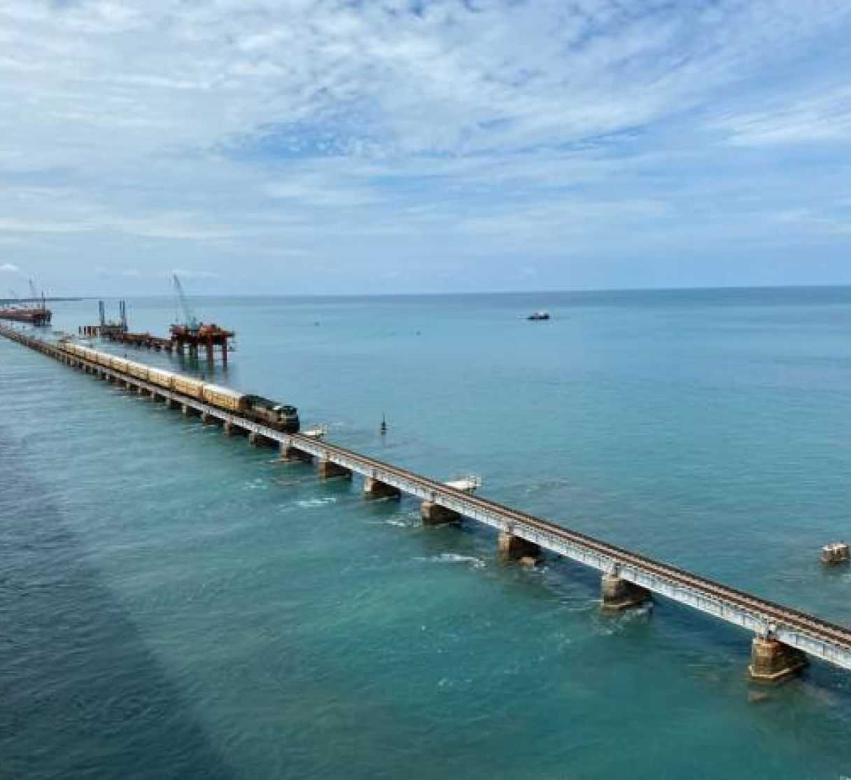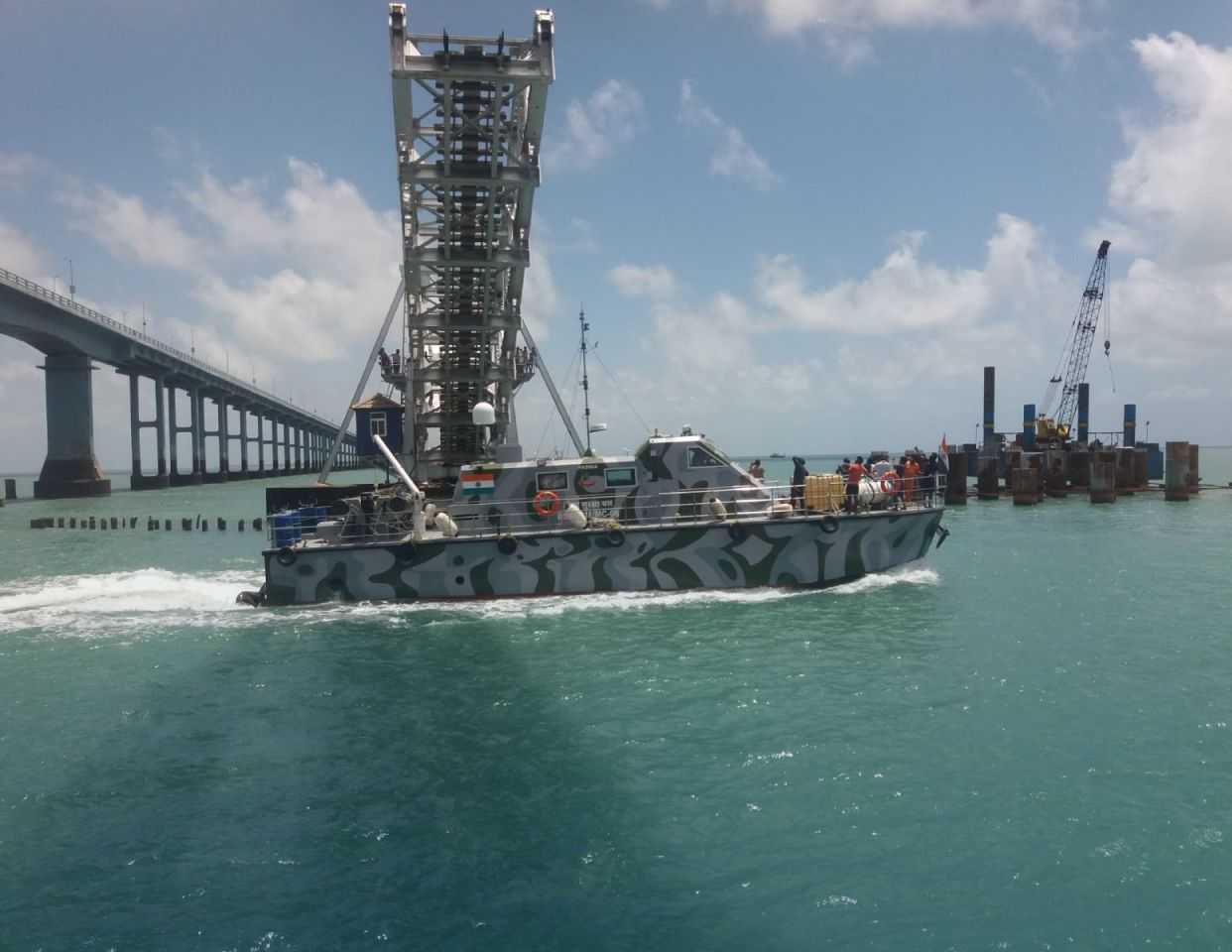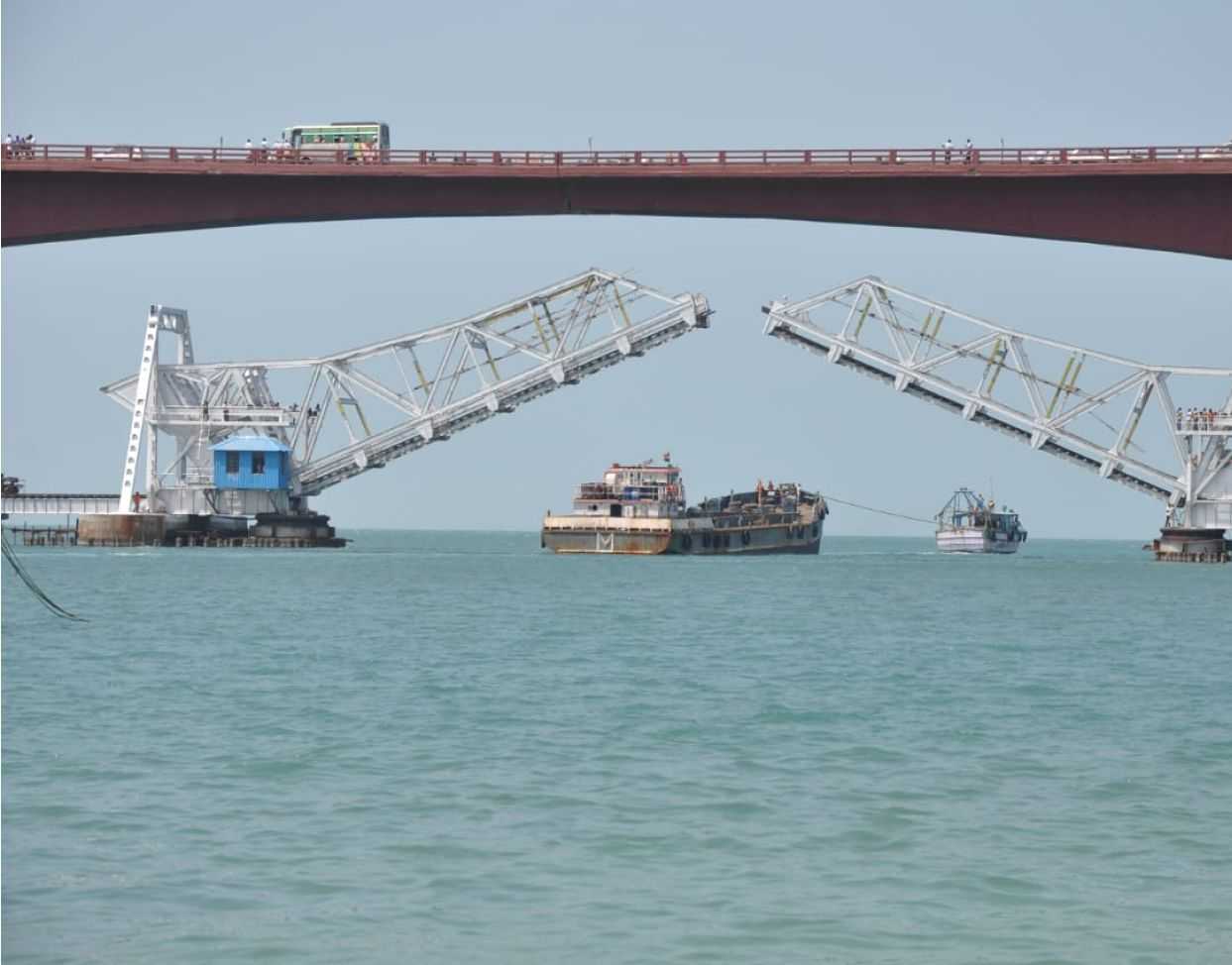 The Pamban Channel, situated between mainland India and Rameswaram Island, is traversed by the impressive 2.3 km long Pamban Bridge. The Pamban Bridge comprises both a cantilever railway bridge and a two-lane road bridge, making it the longest sea bridge in India. The railway bridge spans 6,776 ft (2,065m) and operates as a double-leaf Bascule Bridge. Previously, manual labor was required to open the bridge's two leaves using levers. Every month, over 10 ships, including cargo carriers, coast guard vessels, fishing boats, and oil tankers, pass through the Pamban Bridge.